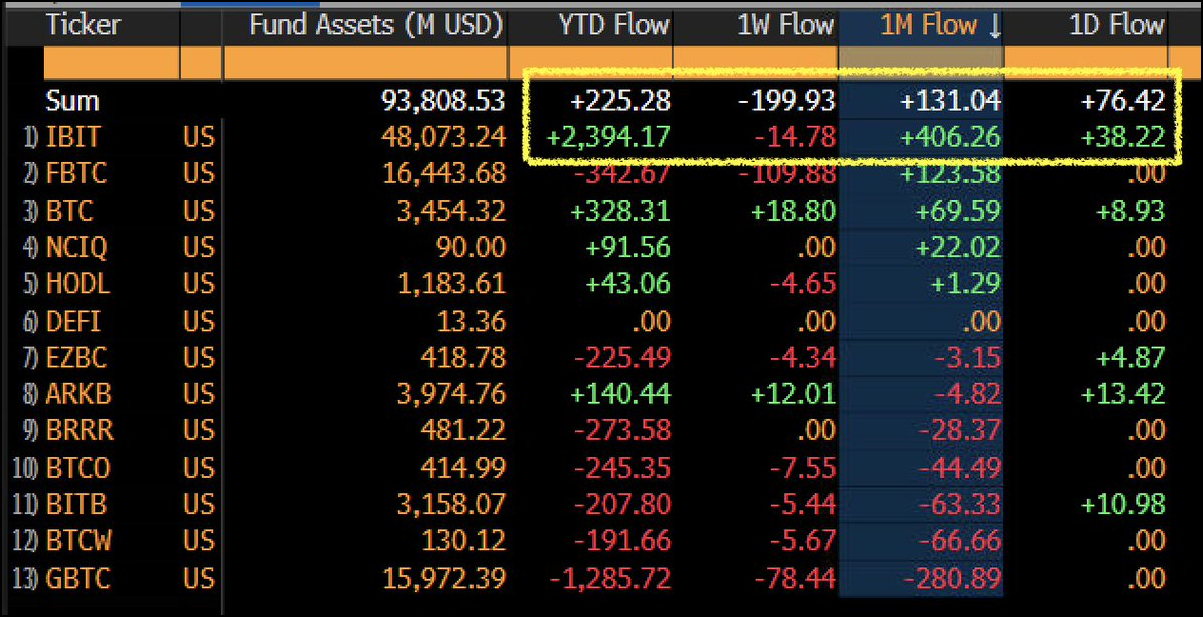 Bitcoin ETFs have eked out positive inflows the past month & YTD and IBIT is $2.4B YTD (Top 1%)