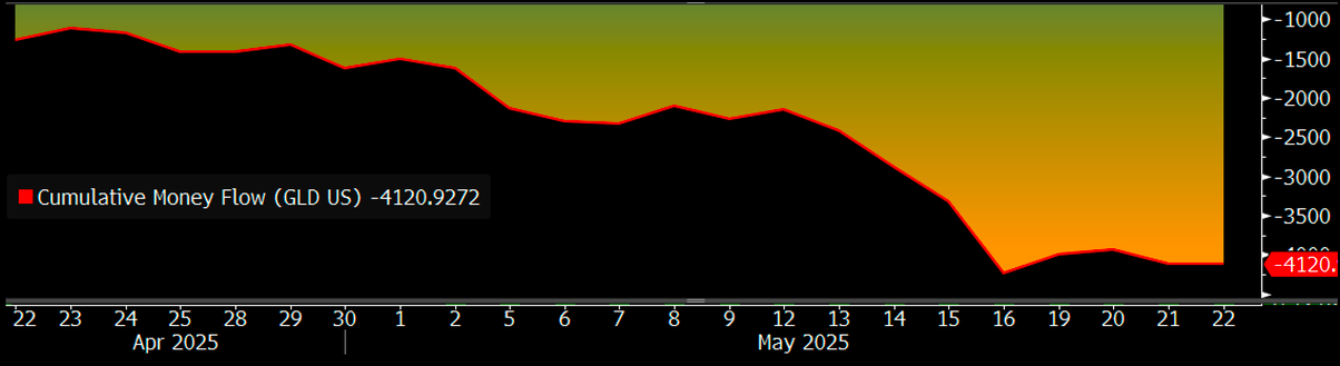 GLD hit hard with outflows, over $4b in past 4 weeks, 2nd worst stretch of monthly outflows ever, as 2024 back risk on mood takes over