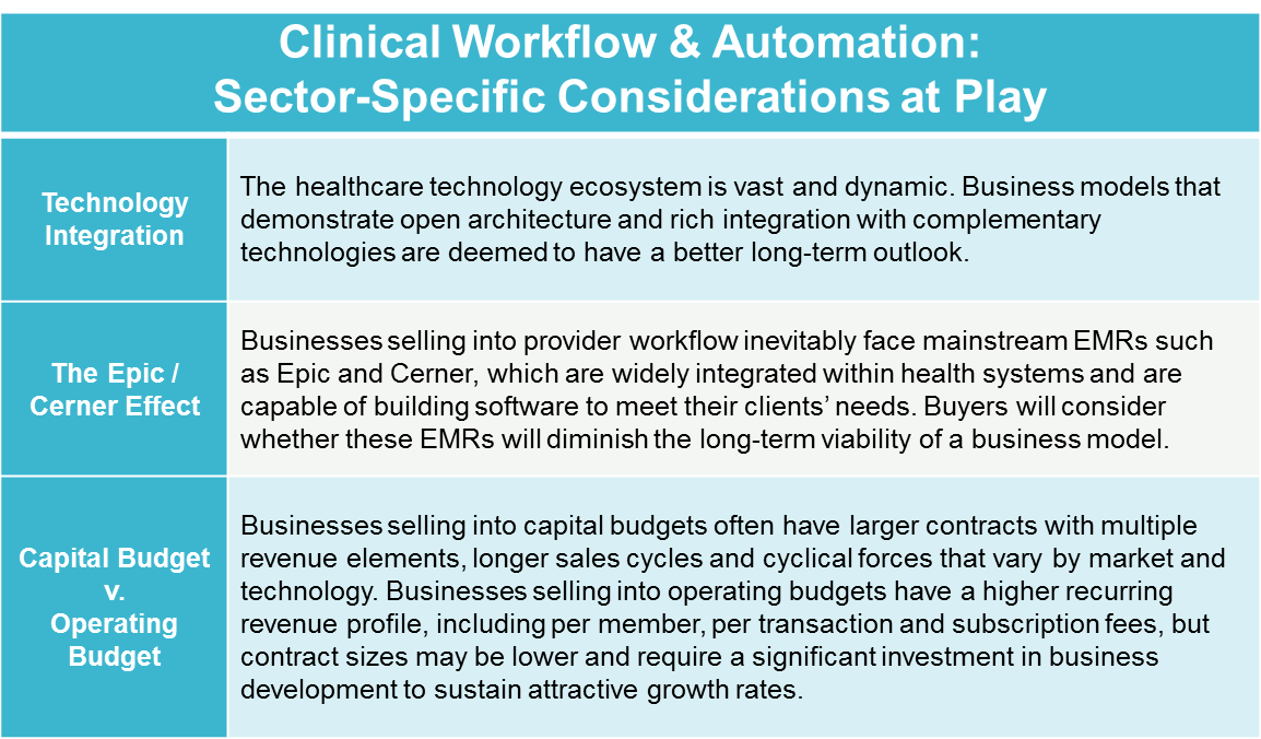 Additionally, a growing number of non-traditional buyers – particularly, diversified technology and industrial players – are showing interest. These companies are finding that clinical workflow and automation is an attractive angle to gain access to a large healthcare market that is ripe with opportunity while leveraging their core competencies in areas such as engineering, manufacturing or data and analytics, without the regulatory considerations or reimbursement risks typically associated with insurance and life sciences companies. While these buyers are very selective about the assets they pursue, they can move aggressively when they discover a good fit and often generate premium transaction outcomes.