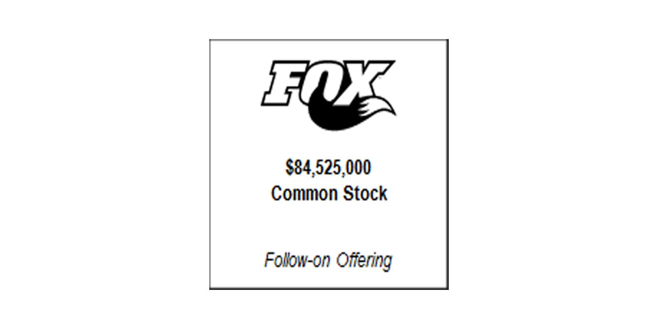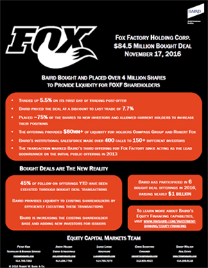 - The transaction marked Baird’s third offering for Fox Factory since acting as the lead bookrunner on the initial public offering in 2013
