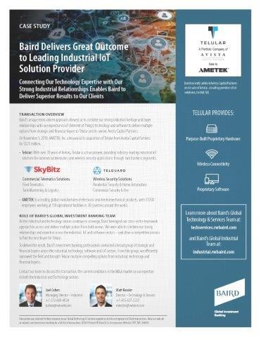 As the industrial and technology sectors continue to converge, Baird leveraged our cross-sector teamwork approach to access and deliver multiple suitors from both arenas. We were able to combine our strong relationships and expertise across the industrial, IoT and software sectors – and drive a competitive process to find the best buyer for Telular.