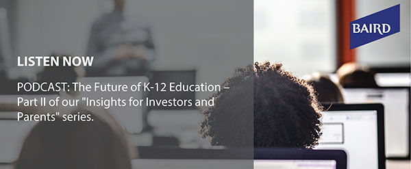 Baird continues its series of Podcasts with Part II of our discussion with Vanessa Webb and Chip Greene, the Co-Heads of Oliver Wyman’s Global Education Practice. In this edition, we focus on the K-12 school system and the impact the COVID-19 pandemic is having on schools, teachers, solution providers and families.