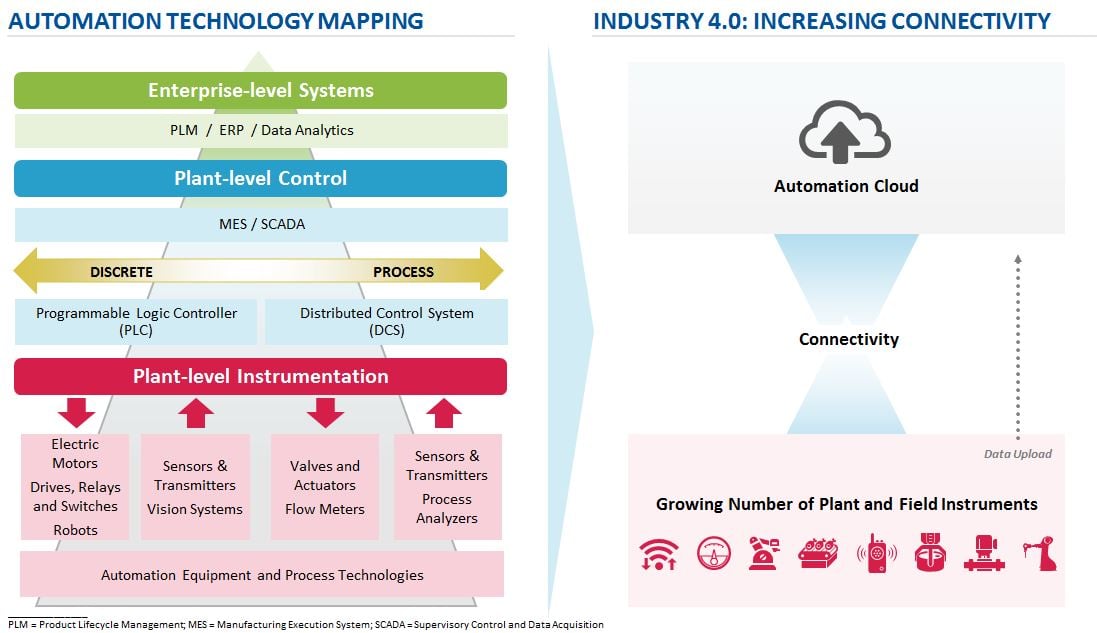 Businesses across the automation technology spectrum (illustration below) are poised to benefit from this accelerating adoption – everything from plant-level instrumentation to plant-level controls, to enterprise-level systems. In addition to opportunities from increased adoption in new end markets, these new automation systems will increasingly include advanced connectivity capabilities to meet data/analytics demands and will require additional support from automation partners enlarging the already attractive opportunity.