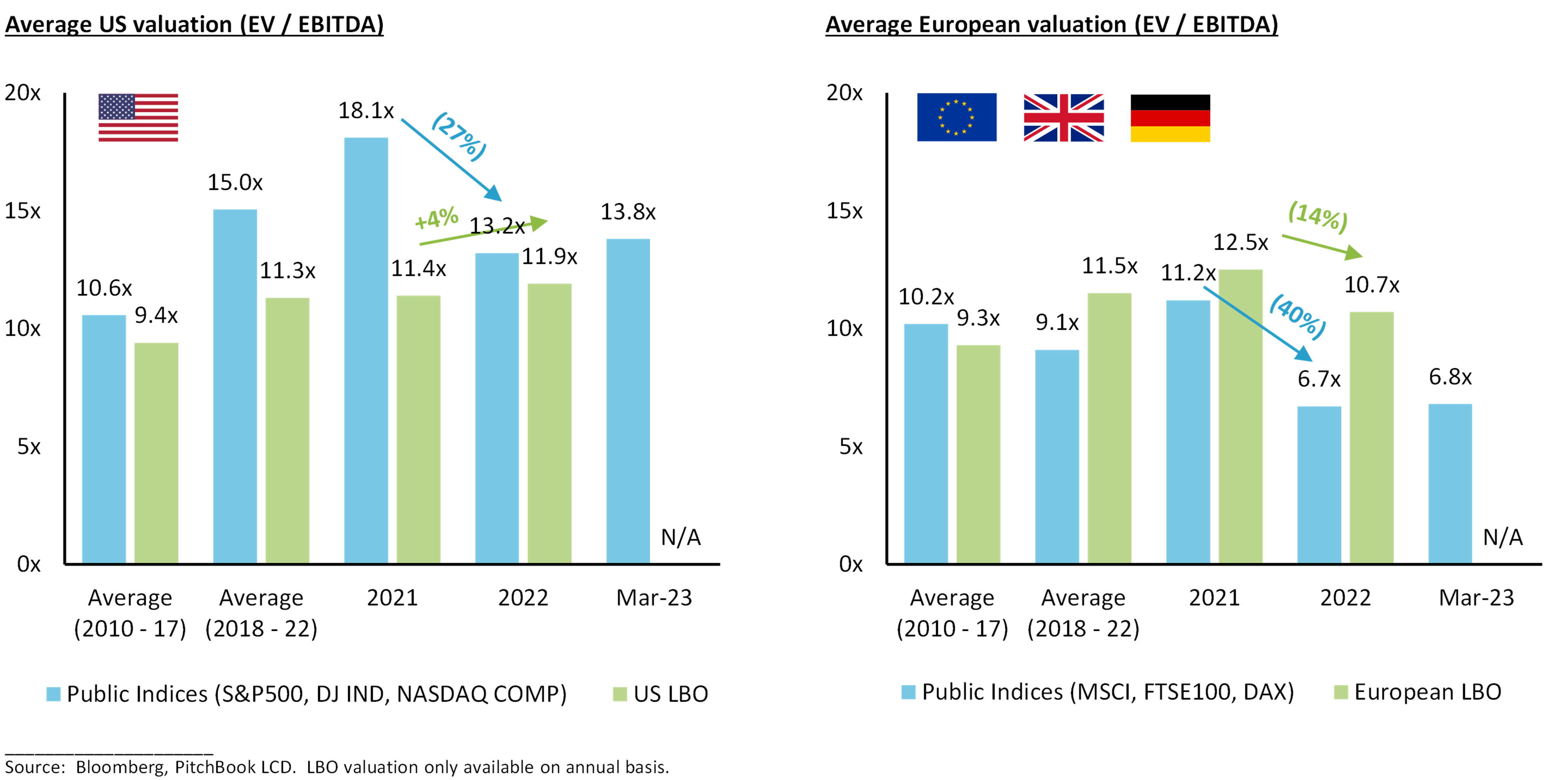 On the other hand, valuation levels for the private M&A market appeared relatively resilient, with the average LBO (leveraged buyout) multiple staying relatively flat in the US and down 15% in Europe in 2022. However, we have seen a number of US LBO transactions in Q1 2023 where valuation levels have come down by 10% to 20% compared to similarly sized businesses in the same subsector that transacted in 2021. Most of these were PE-to-PE deals where the vendor did not suffer EBITDA multiple contraction during ownership because the company was meaningfully smaller at entry.
