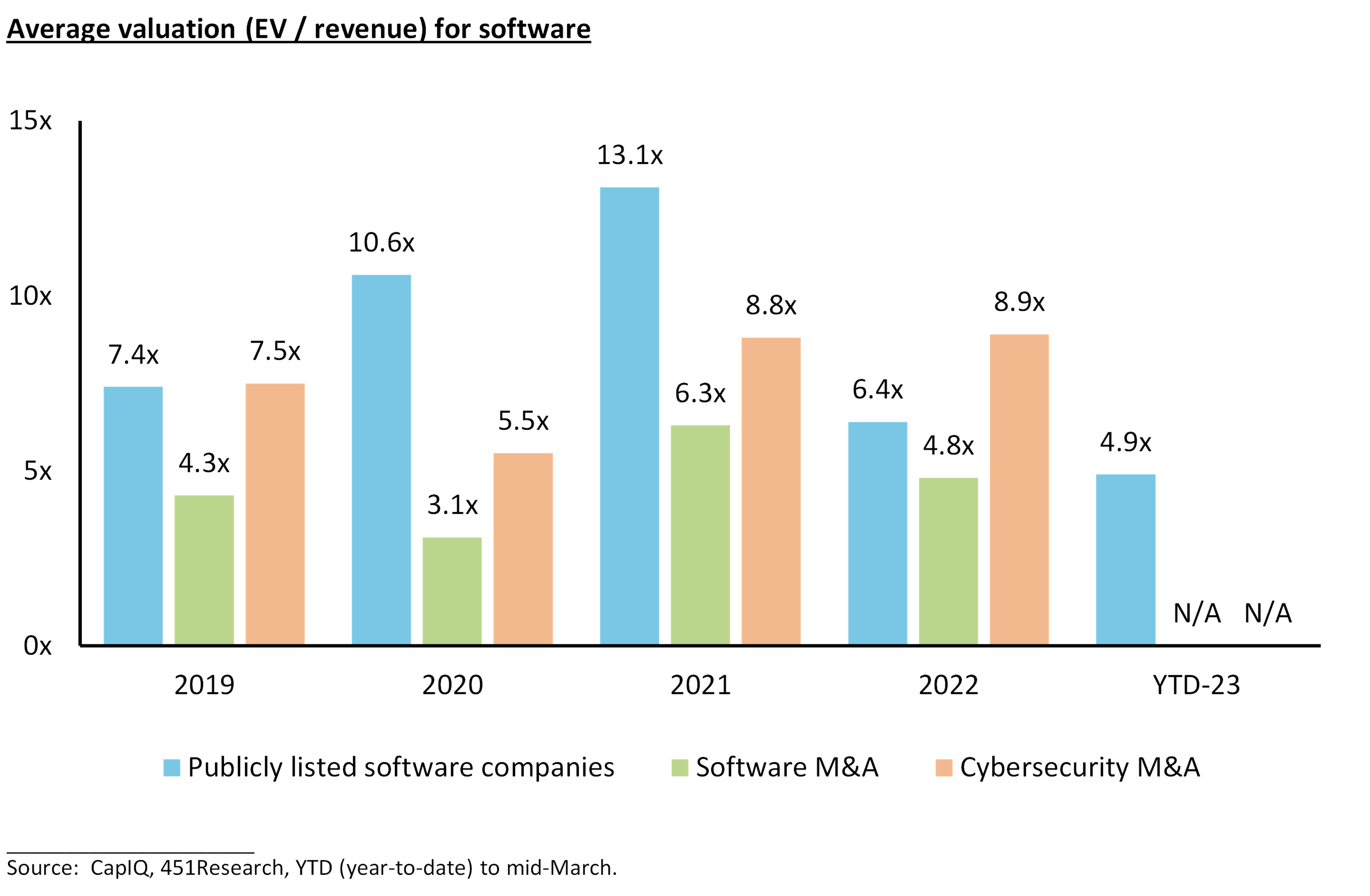The large public software players are generally perceived to be lower risk and therefore benefit from higher valuations than smaller private players. However, their public valuation is now similar to the average of software M&A transactions in 2022 and actually lower than many mid-market M&A software deals completed between 5x and 9x ARR (annual recuring revenue) in recent months. For certain subsectors within software, such as cybersecurity, private M&A valuation has not come down as they are driven by recession resilient, secular growth themes. For well performing private businesses, the public markets are not always a strong indicator of a private company’s true value.