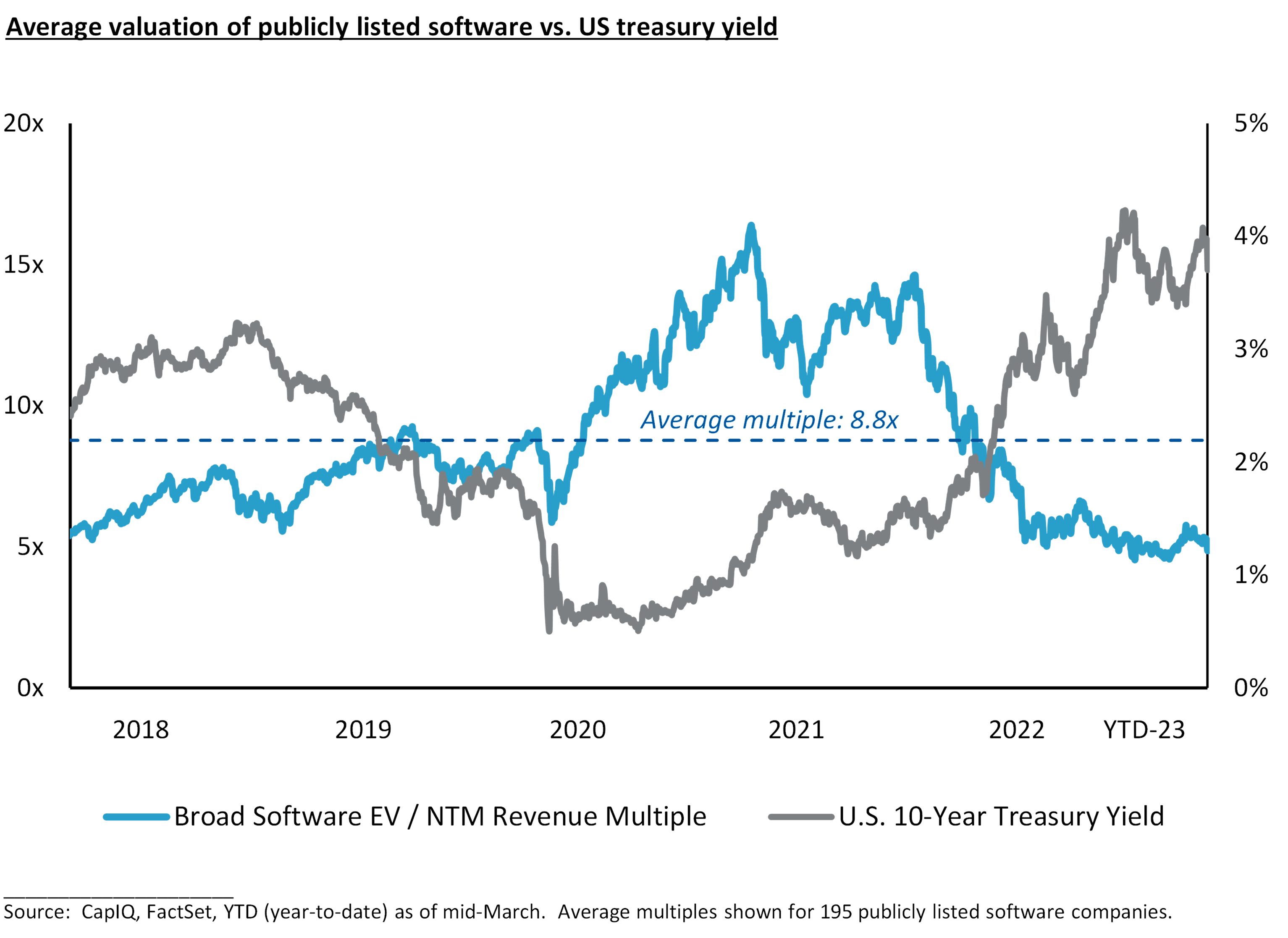 Public market performance is often inversely correlated to interest rates, particularly for “growth” stocks. As such, publicly listed software companies saw their valuation fall by over 50% from over 13x NTM (next twelve months) revenue in 2021 to 5x by mid-2022. There was a noticeable lag in private markets, which took all 6 months of H2 2022 for software M&A valuations to gradually slide down.