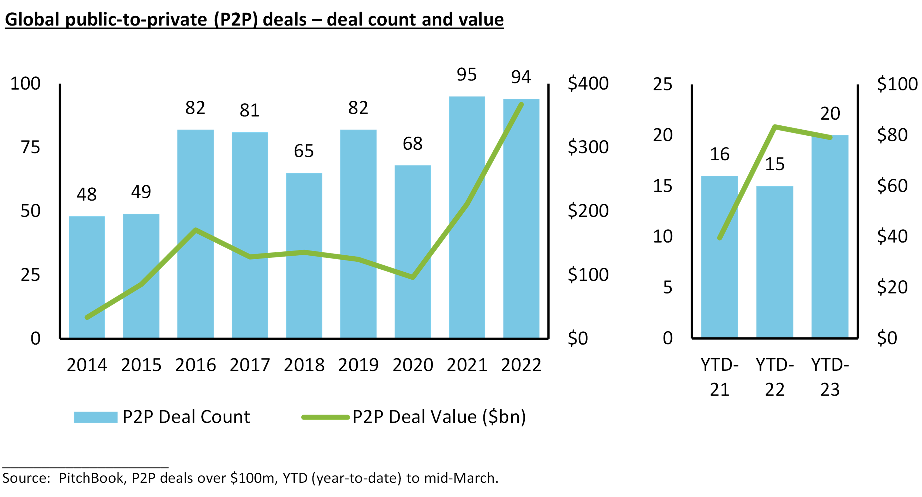 Strong public-to-private (P2P) activity in 2022 was driven by lower (thus more attractive) public company valuations and a willingness by large-cap sponsors to deploy dry powder on bigger targets. P2P activity continues and represents an even higher proportion of overall M&A in YTD 2023 despite the difficulties in obtaining debt financing for $1bn+ deals. This implies that PE firms believe many publicly listed companies are undervalued, even when including the “control premium”. In some of these cases, the PE buyer partially exited the company via an IPO in recent years and still held a minority stake in the listed company at the time of the take-private.