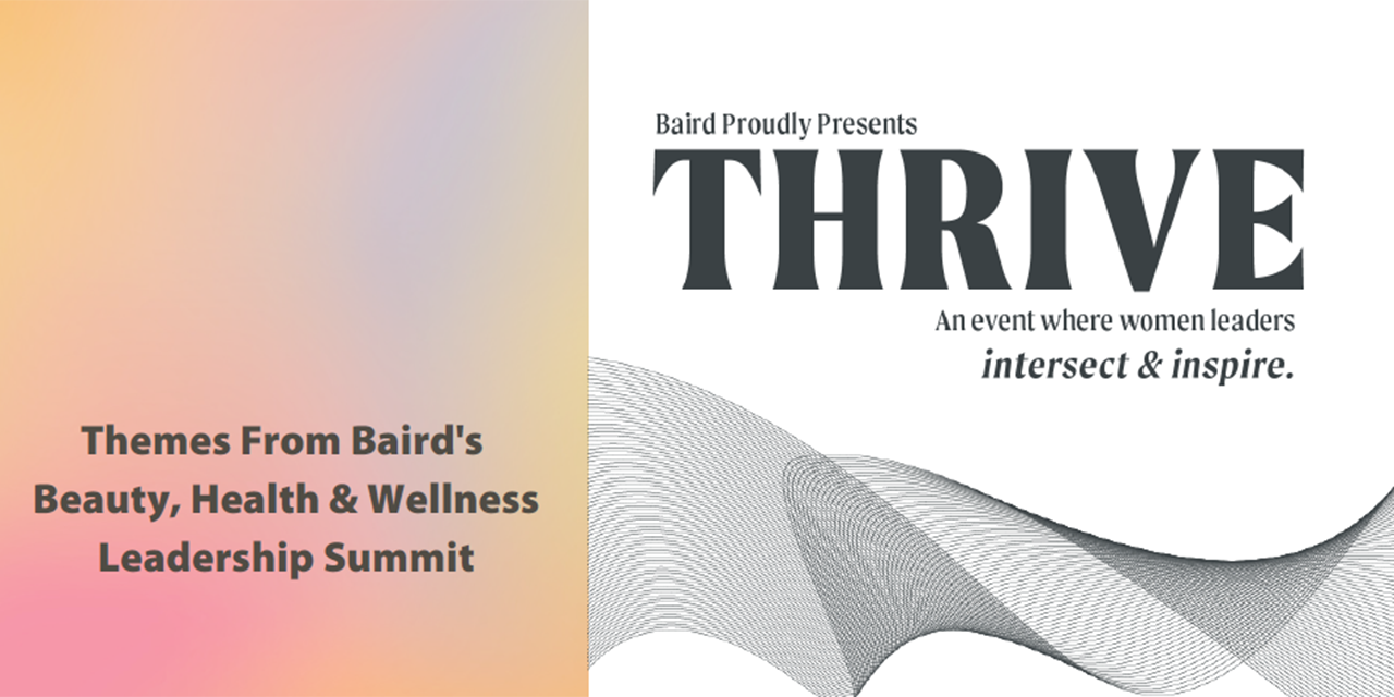 Baird recently hosted THRIVE, a first-of-its kind event, bringing together extraordinary, successful women for networking and to explore topics across business, leadership and wealth creation. Led by several accomplished speaker attendees, the group engaged in focused discussions around the experience of being a female founder, the state of the economy and macroeconomic environment and attractive opportunities for investment in the beauty, health and wellness space.