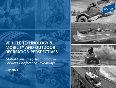 Baird's Vehicle Technology & Mobility team recently hosted a highly diversified and expansive set of leading VT&M and Outdoor Recreation companies within its annual Global Consumer, Technology & Services Conference.
