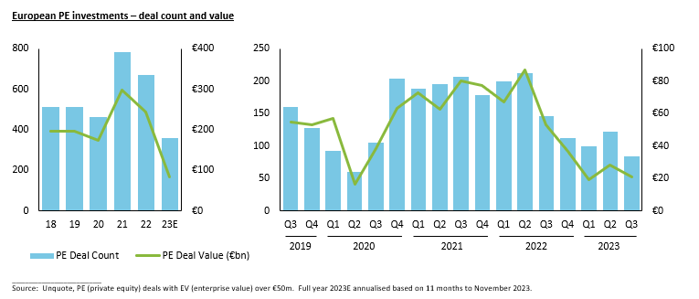 European private equity (PE) activity (for investments over €50m in enterprise value) has likely reached its trough in 2023 with deal count and value down 45% and 65% respectively compared to 2022. The pent-up supply and demand after an 18 month lull in PE activity has created a substantial M&A pipeline where companies / shareholders have mandated an M&A advisor, but have not yet launched their sale process in the market. Most of these mandates are in the preparation phase, aiming to launch in 2024 assuming company financial performance is on track and improving sentiment around macroeconomic factors such as inflation, interest rates, supply chains and consumer spending.