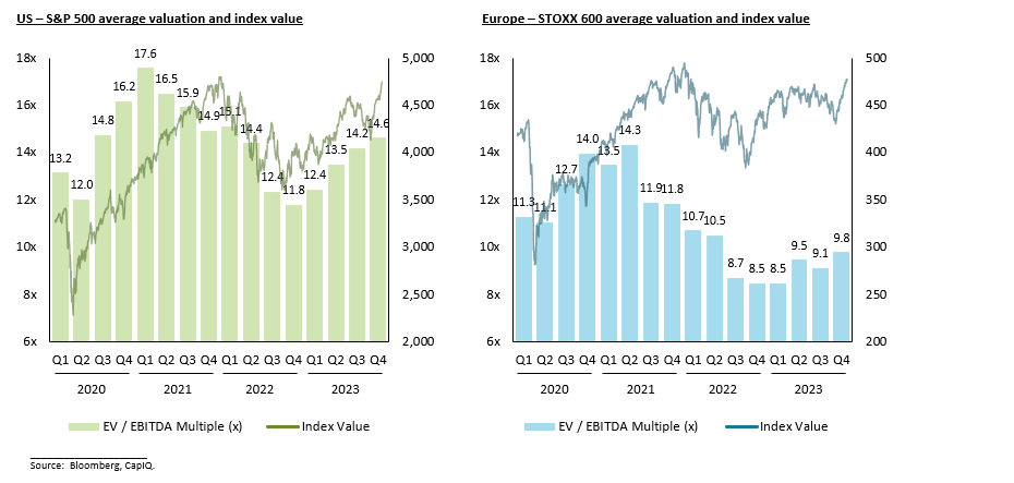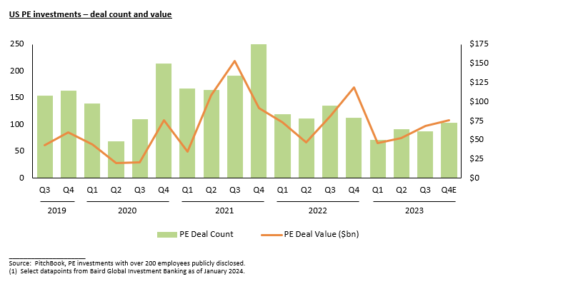 The US has seen strong pitch activity since mid-2023 with Baird adding a significant number of new M&A engagements into the backlog in Q3 2023(1). Many of these mandates were in the preparation phase in Q4 2023, aiming to launch in Q1 2024(1). We began to see a ramp-up in European pitch activity in Q4 2023(1), which is continuing in Q1 2024, for M&A processes also aiming to launch in 2024. We expect the European M&A recovery to come, though lagging that of the US. We are enthusiastic about a recovery in PE investment and exit activity in the US and Europe, highlighted by: