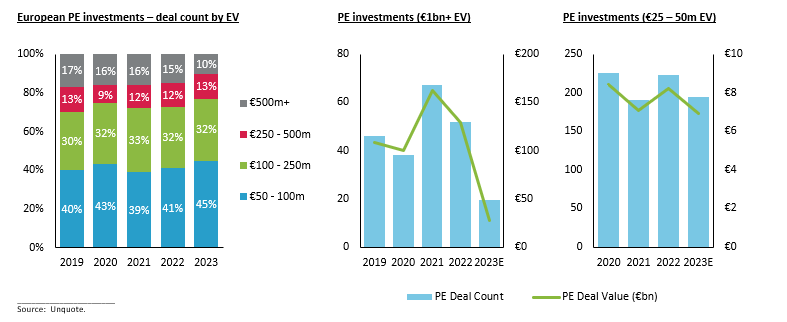 2023 saw a preference for mid-market PE deals given the relative difficulties in obtaining debt financing for credits with above €50m EBITDA. In particular, the lower mid-market (€25 – 50m EV) was highly resilient with 2023 activity on par with 2021. PE firms often acquired these companies (below €10m EBITDA) with a conservative quantum of debt, in some cases below 3x EBITDA. In the upper mid-market, the share of deals with an EV over €500m fell to 10%.