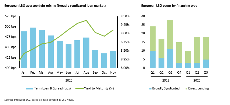 Public broadly syndicated deals have been well received in recent months as investor demand exceeded supply for high quality LBOs above €50m EBITDA. LBO term loan B margins are now below 500 bps and OIDs (original issue discount) at 97+ implies EURIBOR yields of ~9%. Sub 400 bps spreads are being seen for well-known credits.