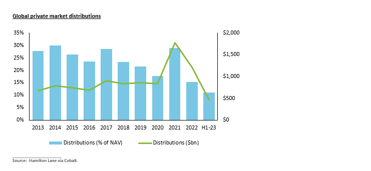 Similar to sponsor deployment, European PE exit activity (for all deal sizes) has likely reached its trough in 2023 with deal count and disclosed deal value down 40% and 60% respectively compared to 2022. As a result, distributions back to LPs have reached a low globally, including Europe. GPs will be under increasing pressure in 2024 to deliver successful exits of portfolio companies or set up continuation vehicles to deliver a partial return on investment. Some LPs could be wary about the overuse of NAV facilities or other “synthetic” forms of DPI (distributed to paid-in capital).