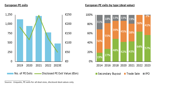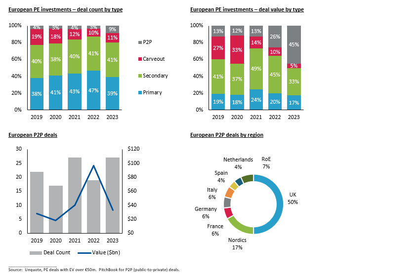 Public-to-private (P2P) deals accounted for a record 9% and 45% of deal count and value respectively in Europe in 2023. PE firms were actively scouring the public markets for targets, partially driven by relatively low company valuations on European stock markets with the STOXX 600 averaging a discount of 30% to the S&P 500. There has been particular interest in the London Stock Exchange with UK companies accounting for half of the year’s P2Ps. However, there is still sometimes a gap between the premium that sponsors are willing to pay and what target boards are willing to accept e.g. Apollo’s unsuccessful approaches to both THG plc and John Wood Group plc in H1 2023.