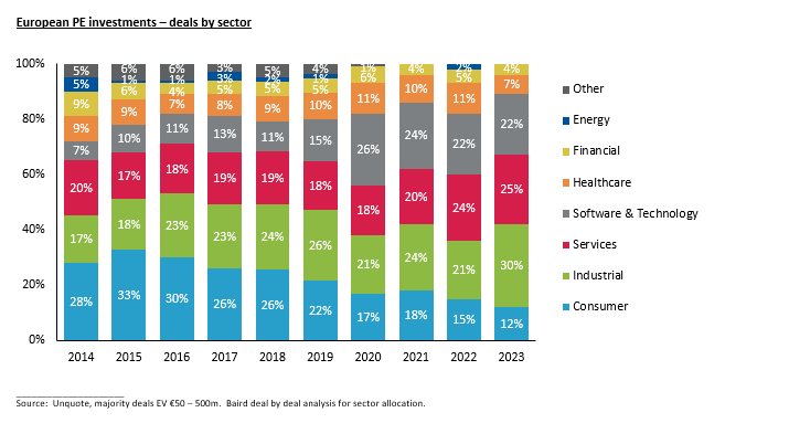 Industrial sector activity reached a record high of 30% in 2023 despite Eurozone manufacturing PMI (purchasing managers’ index) being below 50 (indicates contraction) for the last 23 months. There continues to be a divergence of secular growth themes and timings of certain cycles, forming a paradigm in 2024 where end market and application exposures will matter. PE firms, where they are not outbid by strategic buyers, have had considerable success acquiring defensive industrial assets and investing in their growth through digitalisation and / or add-on acquisitions.