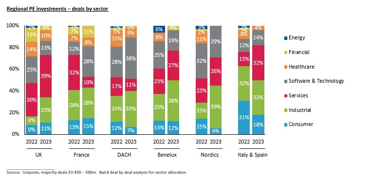 Over 70% of DACH PE investments were in Industrial and Software & Technology, highlighting the depth of the Mittelstand as both a leading exporter of engineered products and a broad customer base for IT solutions. The Nordics saw a similar dynamic with these two sectors representing almost 70% of activity. In 2023, Italy and Spain contributed their lowest share of 11% of European PE activity, and is likely to benefit from a recovery in Consumer M&A in 2024.