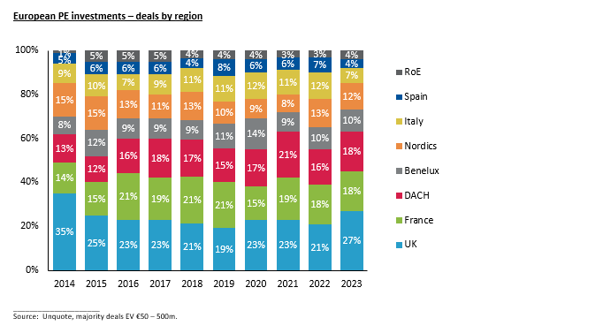 The UK increased its lead as the most active PE investment region in Europe, despite the risk of stagflation during much of 2023. We expect the country will continue its number one position in 2024 given that 23% of the 4,000 European portfolio companies (backed by a sponsor with over $1bn AUM) are based the UK. As a reflection of its broad based strength, the UK saw almost 20 mid-market industrial PE deals across various subsectors.