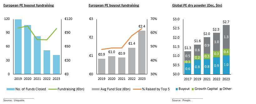 2023 has been the toughest fundraising market since 2009 for many mid-market PE firms. The liquidity crunch from a lack of exit volumes has driven LPs to be more selective with commitments, focusing on larger well-established GPs with a strong track record. This dynamic has led to a robust €100bn being raised for European based buyout funds in 2023, a record 63% of which went to the top 5 fundraising GPs – CVC Capital Partners IX (€26bn), Permira VIII (€16.7bn), PAI Partners VIII (€7.1bn), KKR European Fund VI ($8bn) and Bain Capital Europe VI (€6.4bn). 2024 will see further pressure to deploy the record $2.7tn of global PE dry powder, of which $1tn is for buyout investments.