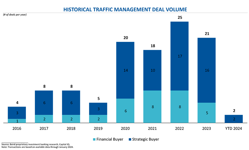 M&A activity is continuing to recover as sellers gain more conviction on taking assets to market. There’s been continued activity for traffic management platforms and add-ons (see chart below). Competition for add-ons persists as existing platforms look to deploy capital by making strategic additions, and because there are more sponsor-owned assets in the sector seeking to pursue buy and build strategies. Further, sponsors looking to build new platforms by acquiring smaller targets are aggressively pursuing those assets.