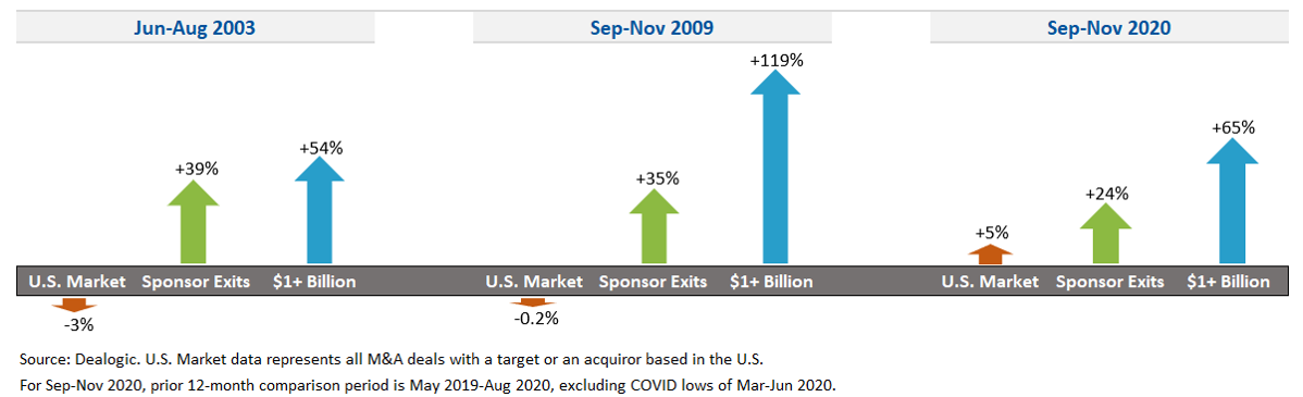 During past M&A cycles, a wave of deals with disclosed values of $1+ billion occurred soon before improvement in the overall market in subsequent months. At the end of past downcycles, both strategic and sponsor buyers were ready to act on larger, coveted assets once sensing a more competitive M&A environment. We see the return to growth for bigger transactions as a positive sign of rising confidence levels among buyers and clearer visibility for the financial performance of targets, pointing to additional deal making on a widespread basis.