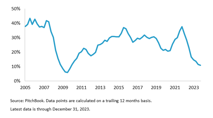 - The level of buyout fund distributions in 2023 was only 11% of net asset value at the start of the period; this represented the lowest percentage in 14 years and was less than half of the 28% average for 2013-2022, illustrating the large upside potential for sponsor selling over a multi-year period.