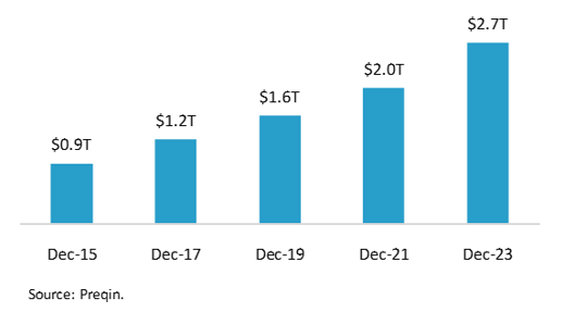 - The buying capacity of PE firms is massive given the 33% growth in global dry powder over just the past two years, climbing to $2.7 trillion (across all forms of private equity) at the end of 2023.