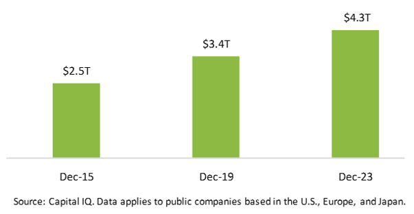 - After year-end 2023 reporting, balance sheet cash reached $4.3 trillion for publicly traded companies (excluding the finance sector) based in the U.S., Europe, or Japan (home to acquirors for nearly 70% of M&A over the past 10 years), up from $2.5 trillion eight years earlier.