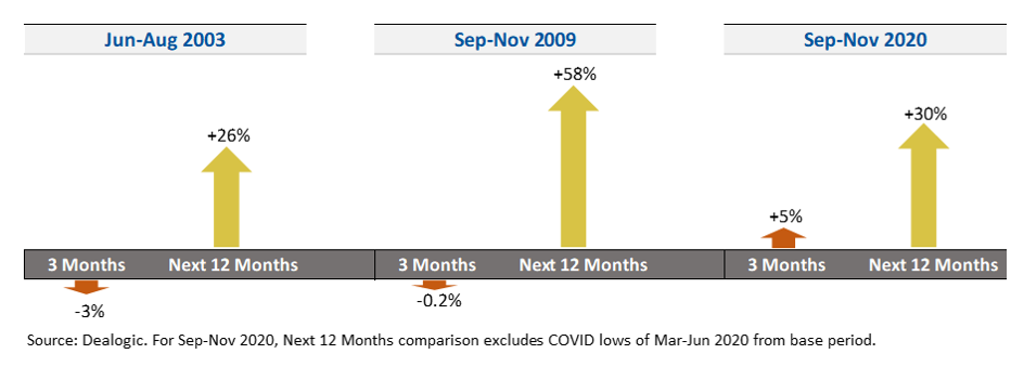- Over the first 12 months of these three M&A upturns, deal count increases ranged from 26% to 58% and averaged 38%.