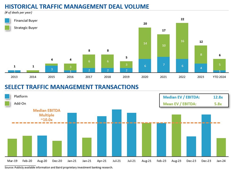 M&A markets have shown a meaningful recovery as transaction volumes have stabilized and large deal activity (i.e., $1B+ TEV) has increased. The traffic management industry has matured – platforms are trading hands between sponsors, and mega funds and infrastructure funds are taking notice of the industry. In addition, more new platforms have been formed as privately owned businesses receive their first institutional capital. Platforms are trading well into the double-digit multiples while add-ons are trading at single-digit multiples; however, competition for add-ons has become fierce with valuations rising for higher-quality businesses.