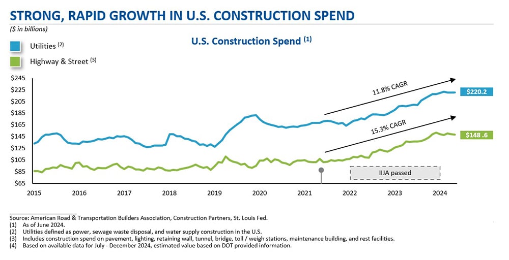 Construction spend on U.S. roads, bridges and utility infrastructure continues to grow necessitating the need for more traffic management services. Outsourcing continues as the work of traffic management companies is seen as mission-critical to completing important infrastructure projects (i.e., building and repair of roads, bridges and utilities) and comes at a relatively low cost to the overall project. The extensive network of existing roads, bridges and utility infrastructure drives a high degree of maintenance work, which is highly reoccurring.
