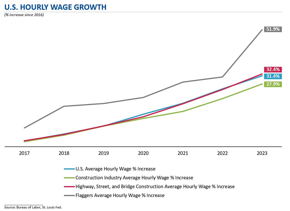 Acquisition of talent has improved but companies still face the challenge of retaining talent. Companies are utilizing customized software and recruiters for difficult-to-hire roles and bulking up internal recruiting resources to meet labor needs and maintain necessary staffing levels. Further, hourly wages for the industry have outpaced U.S. averages – a sign that high demand for and a shortage of available flaggers continues to put pressure on industry wages.