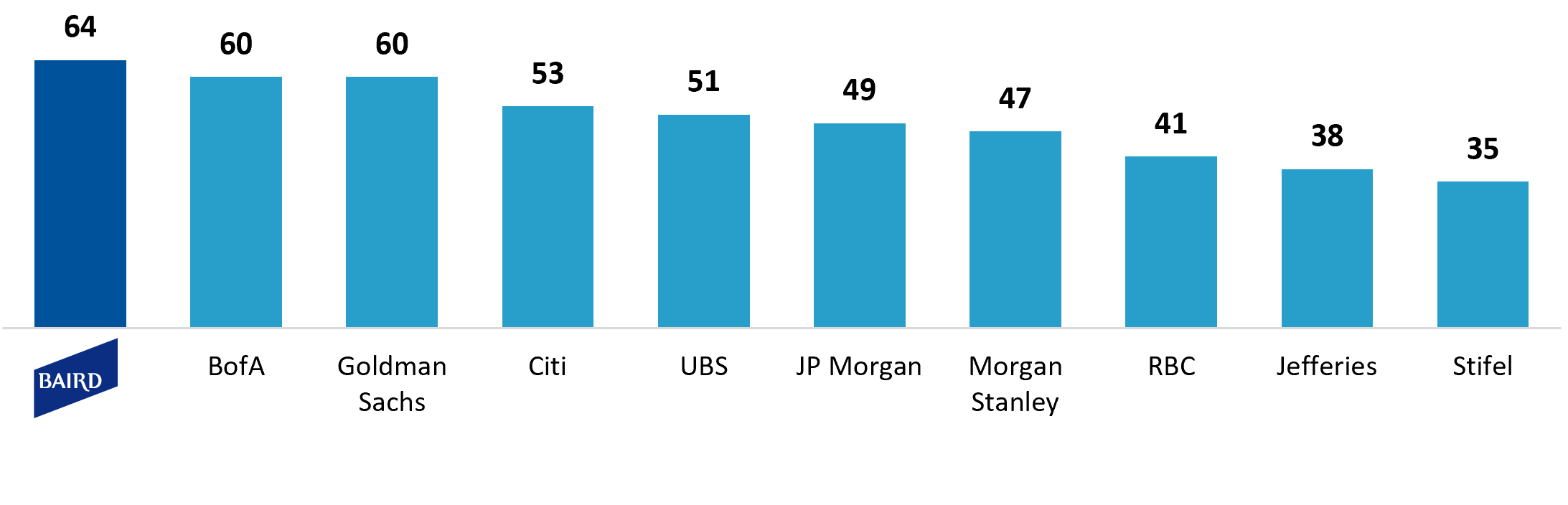Active money managers continue to rely on Baird’s 12 Industrial research analysts, covering over 220 stocks, to help with alpha generation. Also, our Industrial ECM business has been a contributor to strong performance as Baird's Industrial bookrun deals have outperformed other Industrial equity offerings by more than 2x this year.