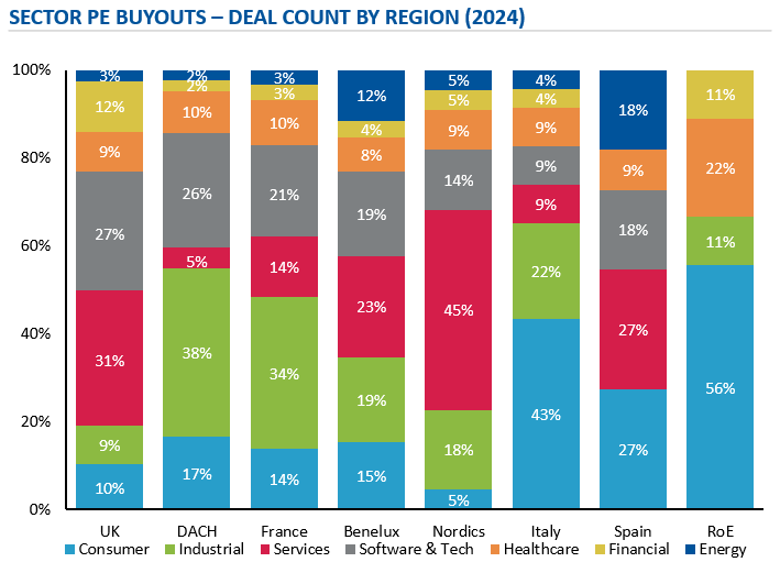 The UK and DACH proved their resilience through the recent M&A downturn, accounting for a record half of European buyouts. DACH (Germany, Austria, Switzerland) is now the second most active region for buyouts, overtaking France for the first time in the last decade. M&A activity in France has in part been negatively impacted by political instability since its elections in mid-2024 produced a hung parliament and subsequent minority coalition government. We are hopeful that sale processes in Germany are less impacted by the federal election that took place on 23 February 2025.