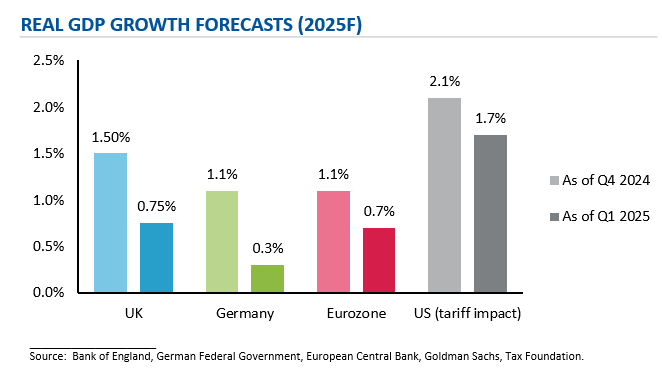 As of February 2025, Donald Trump has applied a 10% additional tariff on imports from China to the US and has temporarily delayed the implementation of a 25% tariff on imports from Canada and Mexico. He suggested that imports from the European Union (EU) to the US could also be subject to a 10% tariff. Furthermore, President Trump effected a 25% tariff on steel and aluminium imports into the US from March 2025. While some economists have forecasted US GDP growth in 2025 to be 40 basis points lower due to the impact of tariffs, GDP forecasts for the UK, Germany and Eurozone have already been reduced for other reasons (does not include impact of tariffs by the US on the EU).