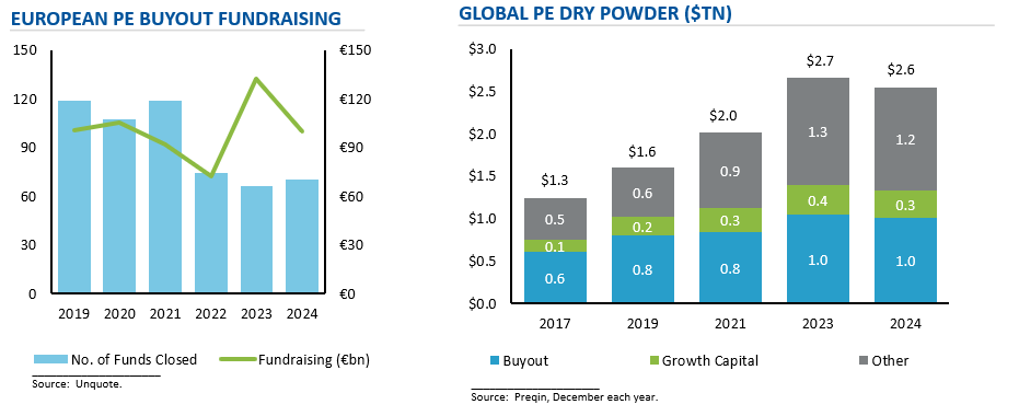 Fundraising volume slowed in 2024 after a strong 2023. €100bn was raised for European based buyout funds in 2024, down 25%. The number of buyout fundraisings fell 40% in the last 3 years compared to 2019 – 2021. The number of new funds coming to market was at a 10 year low and some generalist middle-market funds have been struggling. Globally in 2024, PE firms spent an average of 18 months to hold a final close compared to 9 months in 2019.