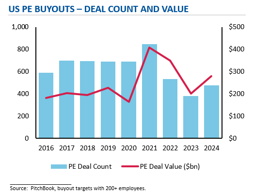 In 2025, we look to the US market to see if a broader set of sale processes launch and successfully transact in the M&A market. Like the European market, US PE activity is up from 2023, but remains below prior levels. The number of US buyouts was up 25% in 2024 compared to 5% in Europe, following previous M&A upcycles, where Europe lags the US by 3 to 6 months. We are hopeful that M&A deal signings, whether as a result of a structured sale process or a bilateral negotiation, in both regions tick up, driven by: