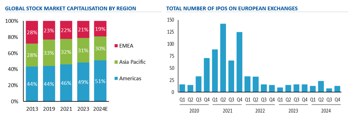 The European public stock markets offered significantly more buying opportunities than PE-backed IPO exits last year. 88 companies delisted (or transferred their primary listing) from the London Stock Exchange in 2024, while there were only 18 IPOs, the lowest in 15 years. The Financial Conduct Authority simplified the UK listings regime last year; however, some UK / European based IPO candidates prefer the depth, liquidity and higher valuation levels of the US stock markets. This could start to change if IPO momentum picks up through a number of successful listings at robust valuation levels on European exchanges in 2025.