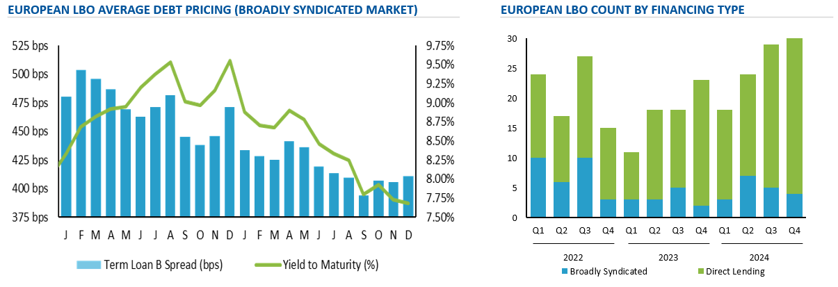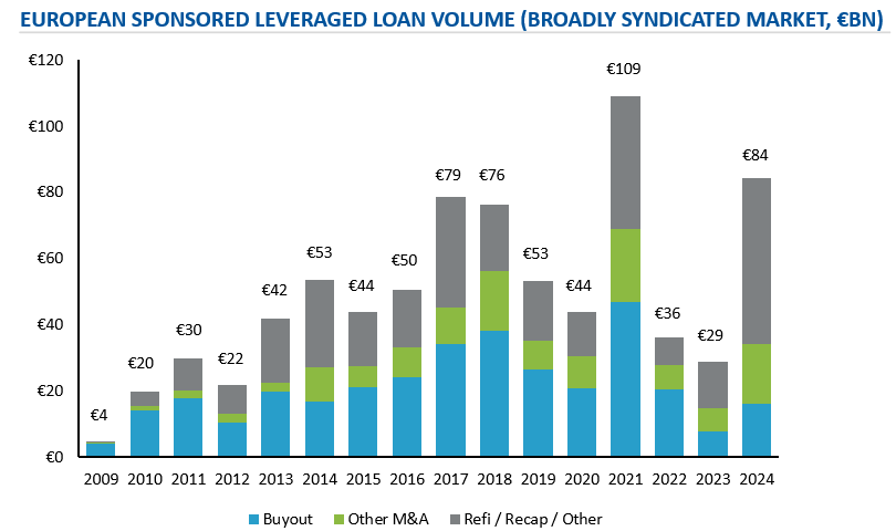 European sponsored leveraged loan volume in the broadly syndicated market reached €84bn in 2024, the second highest since the Great Financial Crisis, largely driven by refinancings and opportunistic repricings. PE firms are also using dividend recaps to provide partial liquidity to LPs to address low DPI (distributions to paid in capital ratio). Pricing pressure prevailed, partly due to the lack of wider M&A opportunities meaning ample dry powder, assisting in holding the average TLB (term loan B) spread at ~400 bps. The 20% share of volume for buyouts in 2024 was the lowest on record for the public debt markets. We expect this share to increase as more M&A processes launch in 2025.