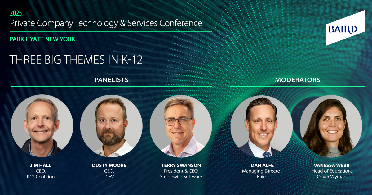 At the firm’s 2025 Private Company Technology & Services Conference, Baird Global Investment Banking held a panel with experts from across the education market to discuss a few major themes impacting the K-12 landscape today.