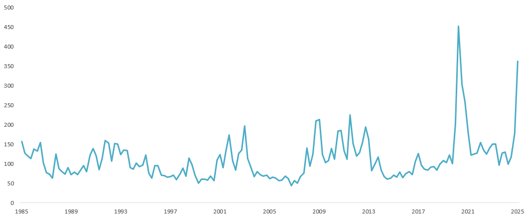 Quarterly data points are based on averages of daily index values from Q1 1985 through Q1 2025.