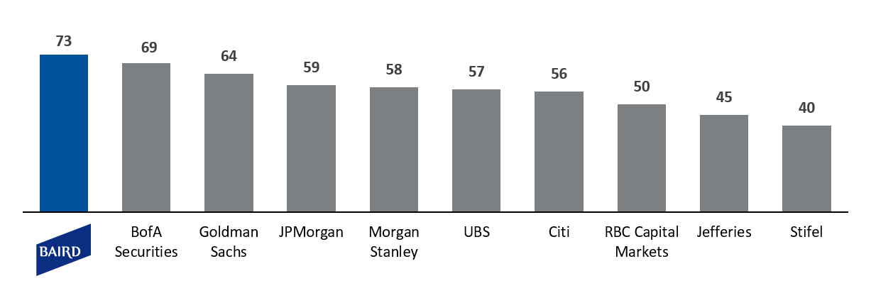 Baird’s Equity Capital Markets team had a strong start to 2025 in the Industrial sector, successfully completing eight transactions and raising ~$4 billion in capital. Building on this momentum, the team expects continued strength in Industrial activity throughout the remainder of the year.