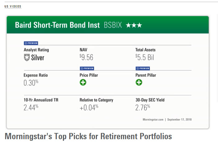 As part of Morningstar's Retirement Readiness special report, a September 20 video highlights Baird Aggregate Bond Fund (BAGIX) and Baird Short Term Bond Fund (BSBIX) as two of “Morningstar’s Top Picks for Retirement.”