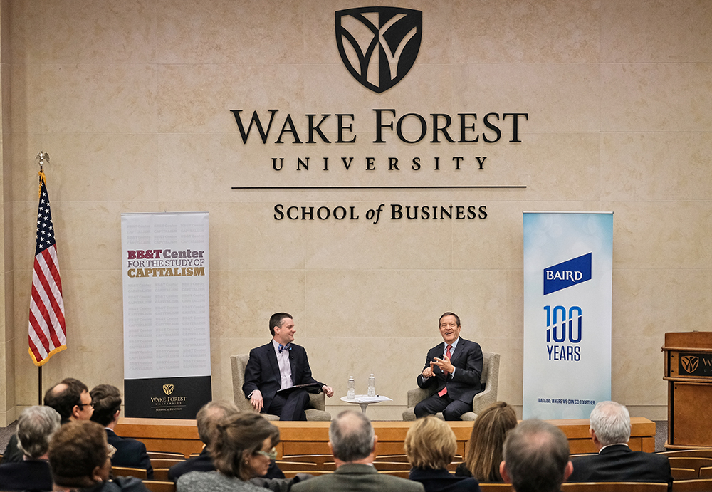 Baird Vice Chairman John Taft spoke at the Wake Forest University School of Business on April 2 about the role that finance should play in advancing the goals of society. Taft noted how ethics, stewardship, and inclusion and diversity are essential ingredients in order for finance to advance society. In addition, he touched on numerous themes highlighted in his books "Stewardship: Lessons Learned from the Lost Culture of Wall Street" and "A Force for Good: How Enlightened Finance Can Restore Faith in Capitalism."
