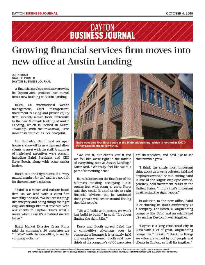 On Thursday, October 3, Baird’s PWM branch in Dayton, Ohio hosted an open house to celebrate their new office space within Austin Landing. In attendance was Steve Booth – President & CEO, Brian Kurtz – Area Market Director, Dayton-area Baird associates and over 100 other clients and friends of the firm. A reporter from Dayton Business Journal was also invited, and subsequently published a piece about Baird’s commitment to the Dayton-area as the firm’s footprint continues to grow.