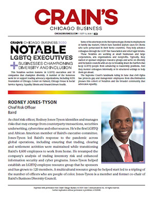Baird’s Chief Risk Officer, Rodney Jones-Tyson, was recently named to Crain’s Chicago Business’s 2020 list of Notable LGBTQ Executives Championing Diversity and Inclusion.