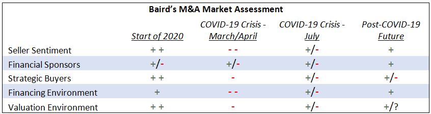 Although M&A market fundamentals continue to be suboptimal, the backdrop for deal making appears to have improved over the last couple of months. Based on our current view of key M&A variables, we believe the headwinds keeping a lid on many transactions have begun to ease. Due to the favorable status of most M&A drivers pre-COVID-19, we expect a substantial number of transactions that have been put on hold to close eventually.
