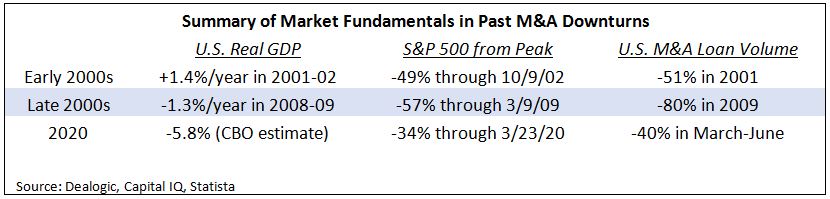 Although conditions remain challenging as we enter the second half of 2020, recent progress in the economy and capital markets has motivated us to find the pockets of strength that marked the start of more constructive periods for M&A activity following the last two major M&A downturns. Based on our evaluation of past cycles, deal metrics for financial sponsor M&A exits and M&A transactions with disclosed value of $200+ million represent potential leading indicators of an upturn in the U.S. M&A market. Over the three months leading into each market recovery, these ranked as the top two for deal count growth among all segments (topping corporate acquisitions/divestitures, sponsor platforms/add-ons, cross-border, public company, and smaller deals), supporting our confidence in their value for signaling better M&A trends.