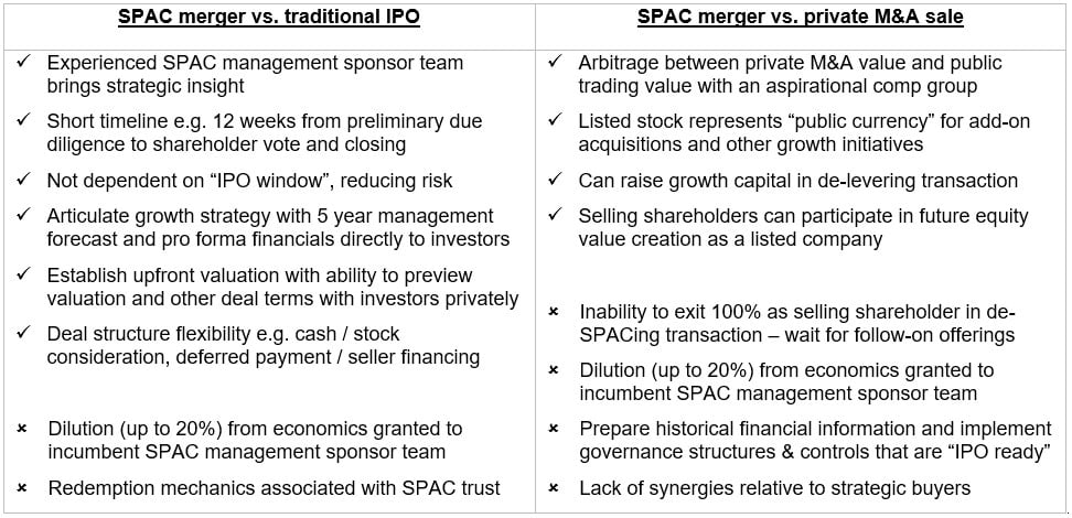 The majority of US SPACs currently pursue capital raises of $200m – $400m. Including the stock roll, the enterprise value offered by SPACs can be $500m – $10bn+ when supported by debt financing and anchored by follow-on equity transactions called PIPEs (private investment in public equity). SPACs are becoming more institutionalised in the US and in many cases represent a viable and attractive alternative to a traditional IPO or M&A sale transaction. An M&A sale of a target still represents the quickest and most efficient route for selling shareholders looking for a majority exit.