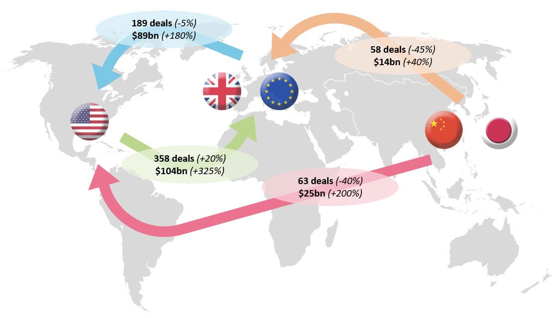 - Tighter regulations for inbound M&A into the US and Europe, especially for technology and infrastructure assets